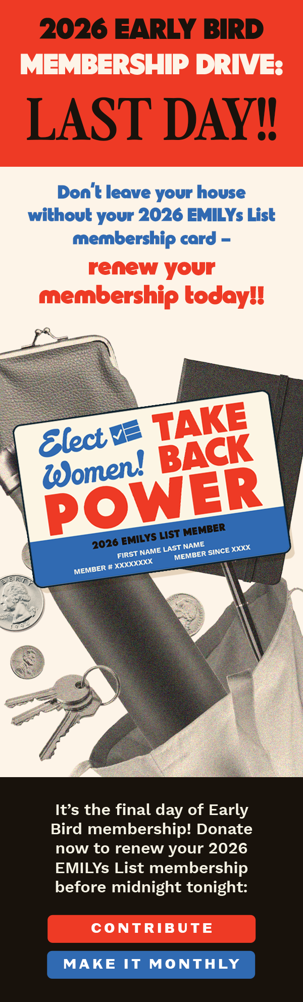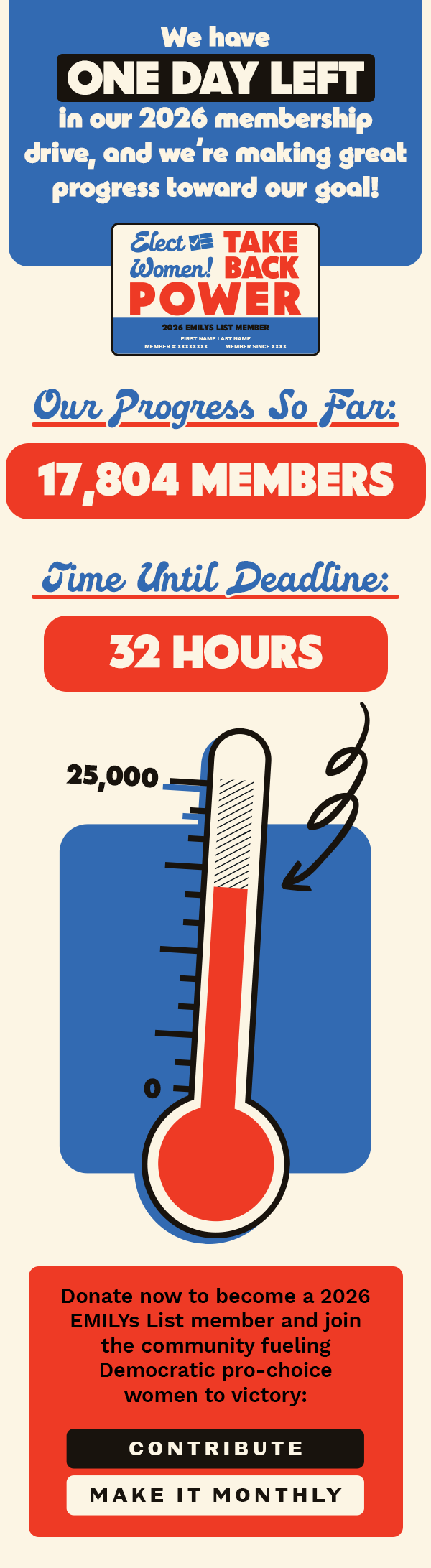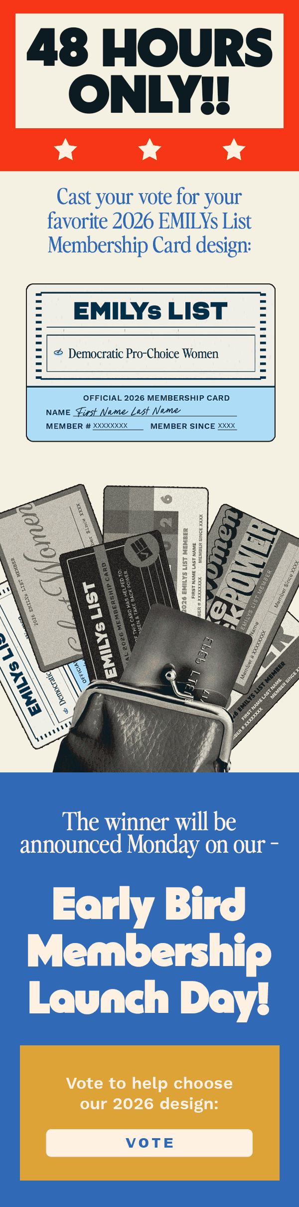 EMILYs List members annually receive a physical card to reflect their membership status. Every year a new, unique design is chosen. In 2025 several designs were created, with four going on to be presented to our email list, which members would then vote on. Once a final card was selected, further collateral was created to promote it.